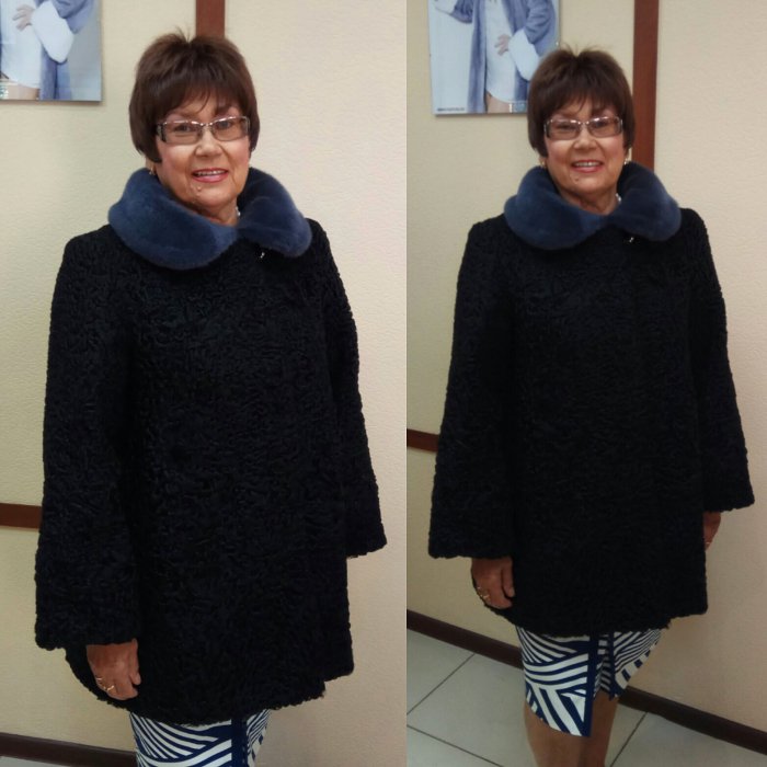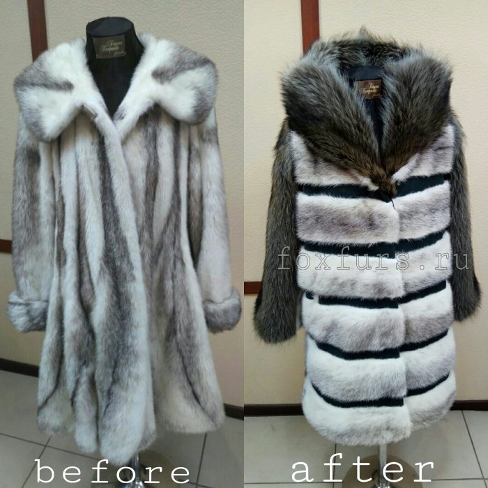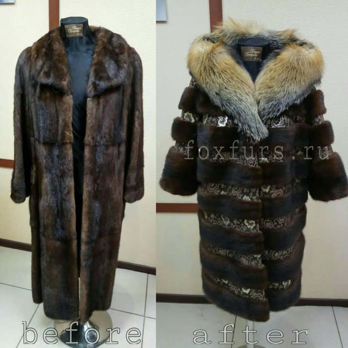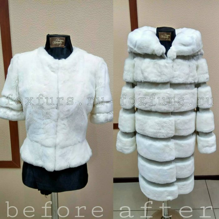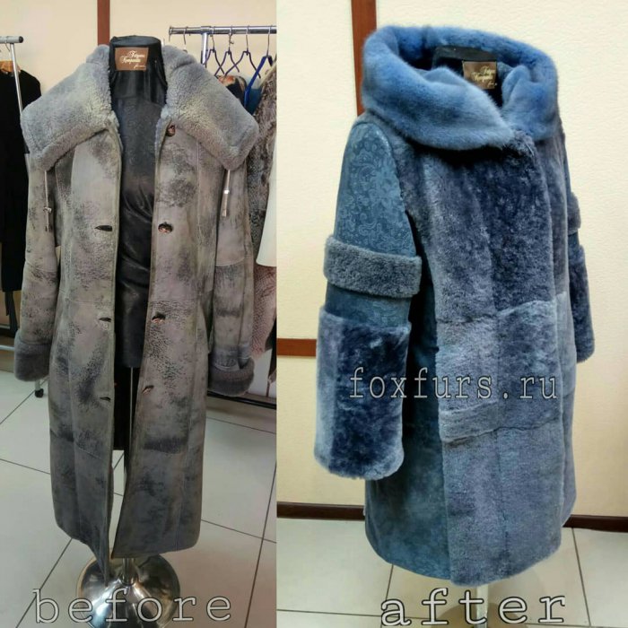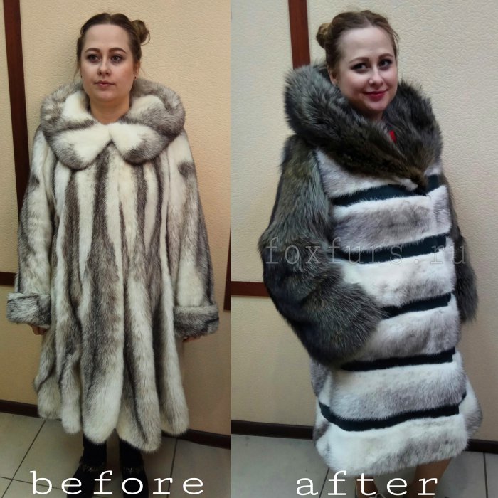 До/После. Был коротенький жакет из кролика, который мы шили примерно 5 лет назад. Выполнили полный перекрой: добавили новые шкурки и нат.замшу, получилось полноценное пальто с капюшоном